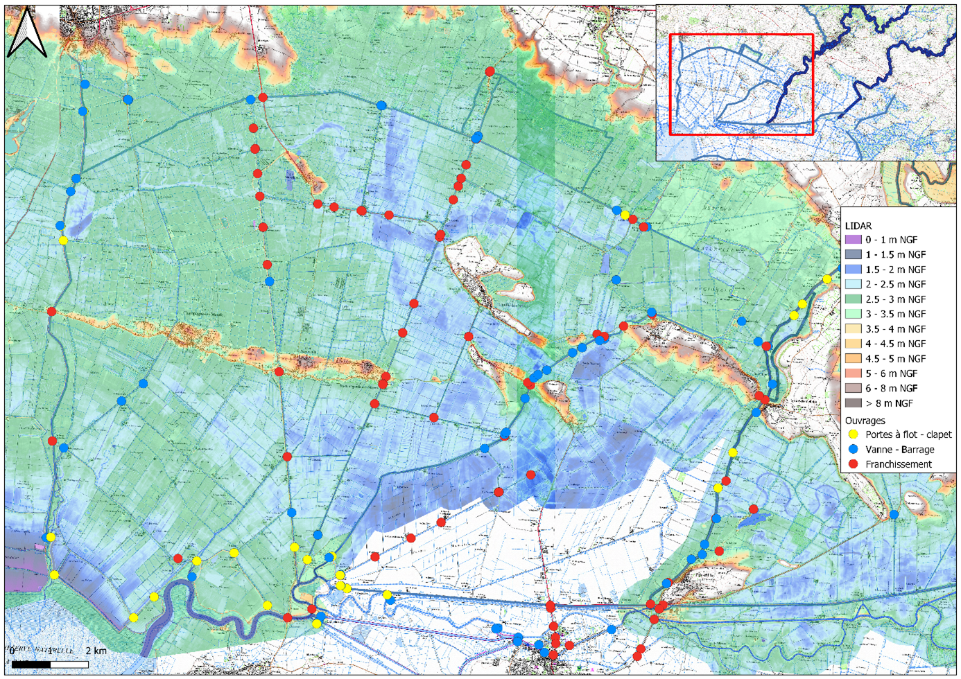 Digues transparentes : Remblais routiers et merlons transparents à l’écoulement majoritairement situés en bord de Sèvre (en jaune sur la carte). Elles sont rendues transparentes par des ouvrages traversants qui permettent à l’eau de monter librement dans les marais mouillés.